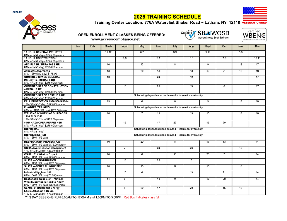 In need of a different class or date? Let us know so we can better serve you! 518-782-2200 ; info@accesscompliance.net
